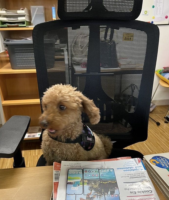 In der Bücherei Elz begleitet sie ihr Frauchen regelmäßig und trifft dort oft ihre Hundefreundin Grace, deren Frauchen ebenfalls im Team arbeitet. Lucy freut sich immer über bekannte Gesichter und neue Begegnungen – und sorgt mit ihrem freundlichen Wesen für gute Laune bei Groß und Klein.