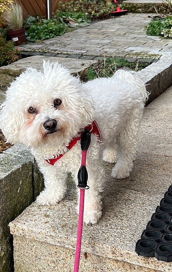 Lucy ist eine elfjährige Bichon Frisé-Dame und wohnt mit ihrem Frauchen Sabine Berneiser, der Leiterin der Bücherei Elz, und deren Mann in Elz.