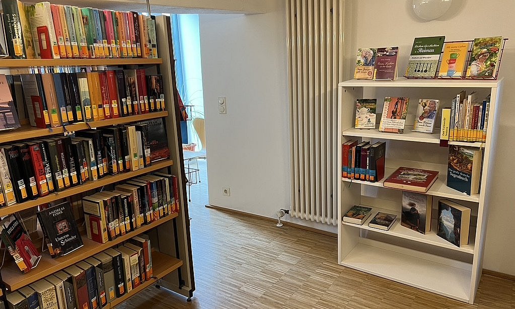 Die Bücher stehen im Obergeschoss im ersten Raum des Altbaus (neben den Romanen in einem extra Regal).
